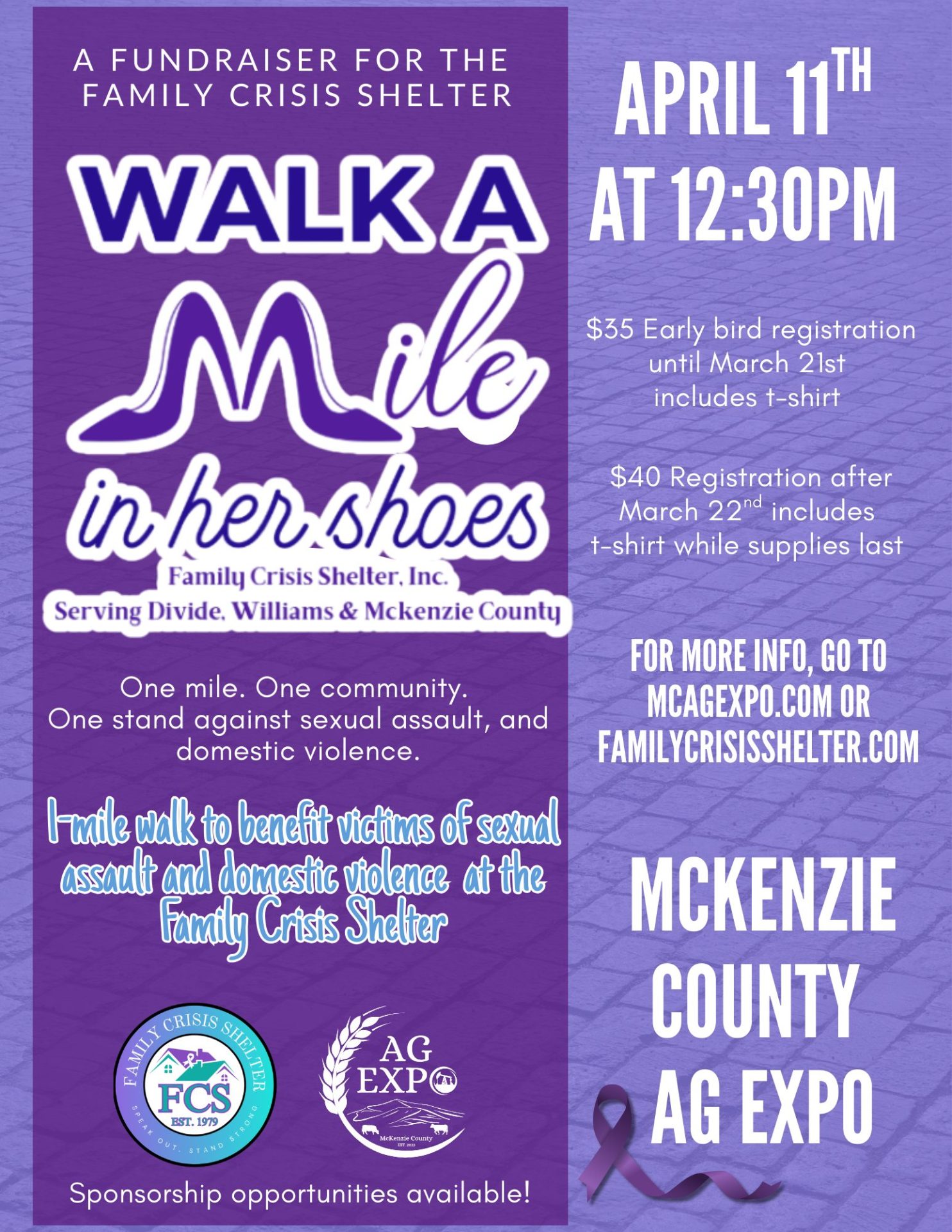 Walk a Mile in Her Shoes is a community event raising awareness and funds for survivors of domestic violence and sexual assault. The walk will take place on April 11 at 12:30 p.m. during our Rec Show (April 10–12), with participants walking one mile around the Ag Expo. All proceeds benefit the McKenzie County Family Crisis Shelter, helping provide safety, resources, and support for those in need. Whether you’re walking in heels or sneakers, every step makes a difference. Join us for a mile that matters.
